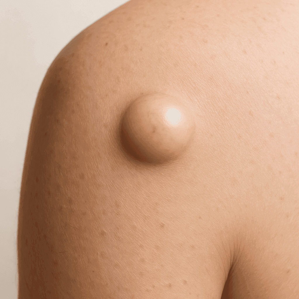 Lipome sind weiche, fettige Knoten unter der Haut, die ebenfalls gutartig sind, sich jedoch in ihrer Beschaffenheit und Zusammensetzung von Zysten unterscheiden. Im Gegensatz zu Epidermoidzysten bestehen Lipome aus Fettgewebe und fühlen sich in der Regel weicher an. Um sie voneinander zu unterscheiden, ist eine sorgfältige körperliche Untersuchung und manchmal auch eine Bildgebung erforderlich.