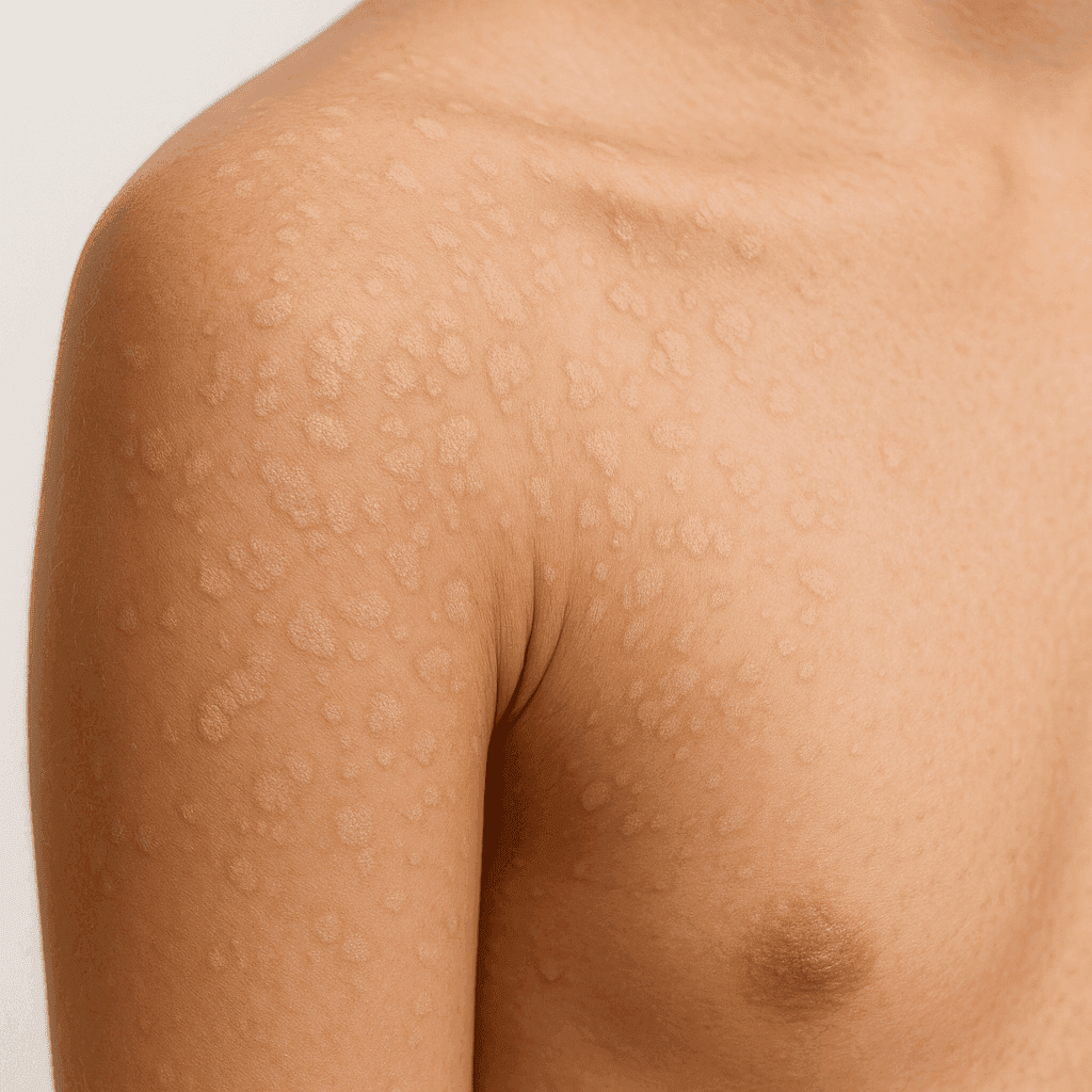 Pityriasis versicolor is a fungal infection of the skin caused by an overgrowth of yeast that is naturally present on the skin. This condition is characterized by patches of skin that differ in color from the surrounding areas. These patches can appear on various parts of the body, including the chest, back, neck, and arms.
