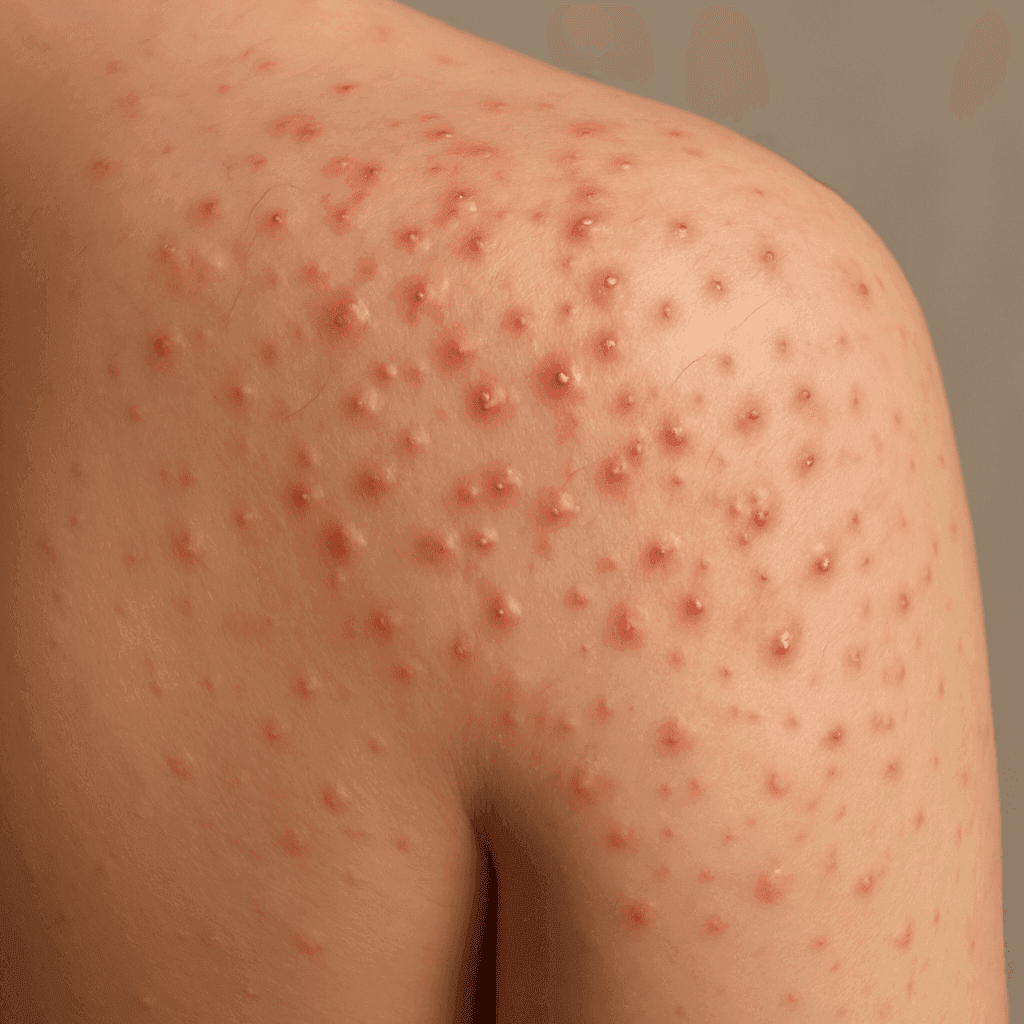 Post-shave folliculitis is characterized by red, itchy bumps that appear after shaving. These bumps are most commonly found in areas where the skin is shaved frequently, such as the face, neck, and legs. Symptoms include redness, swelling, and in some cases, pus-filled blisters which resemble acne.