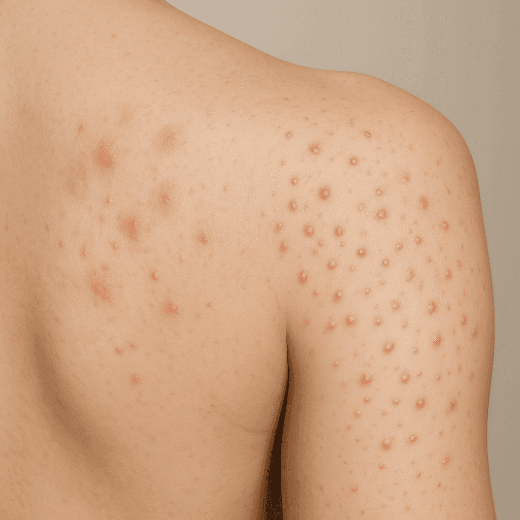 - Pustules: Red bumps with white pus at the tip.