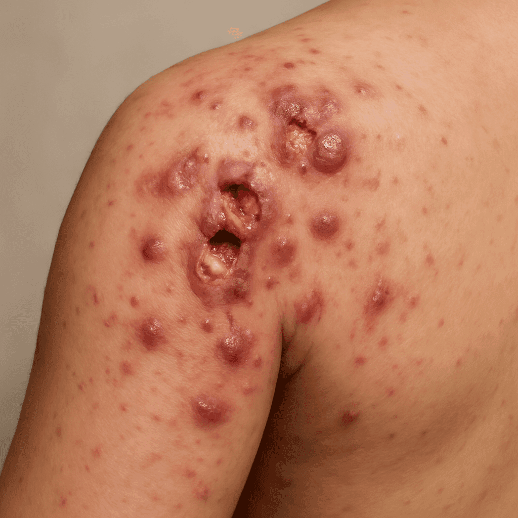 Unlike acne, HS occurs in areas where skin rubs together and involves deeper skin structures. Boils are usually isolated events, whereas HS is chronic and recurrent.