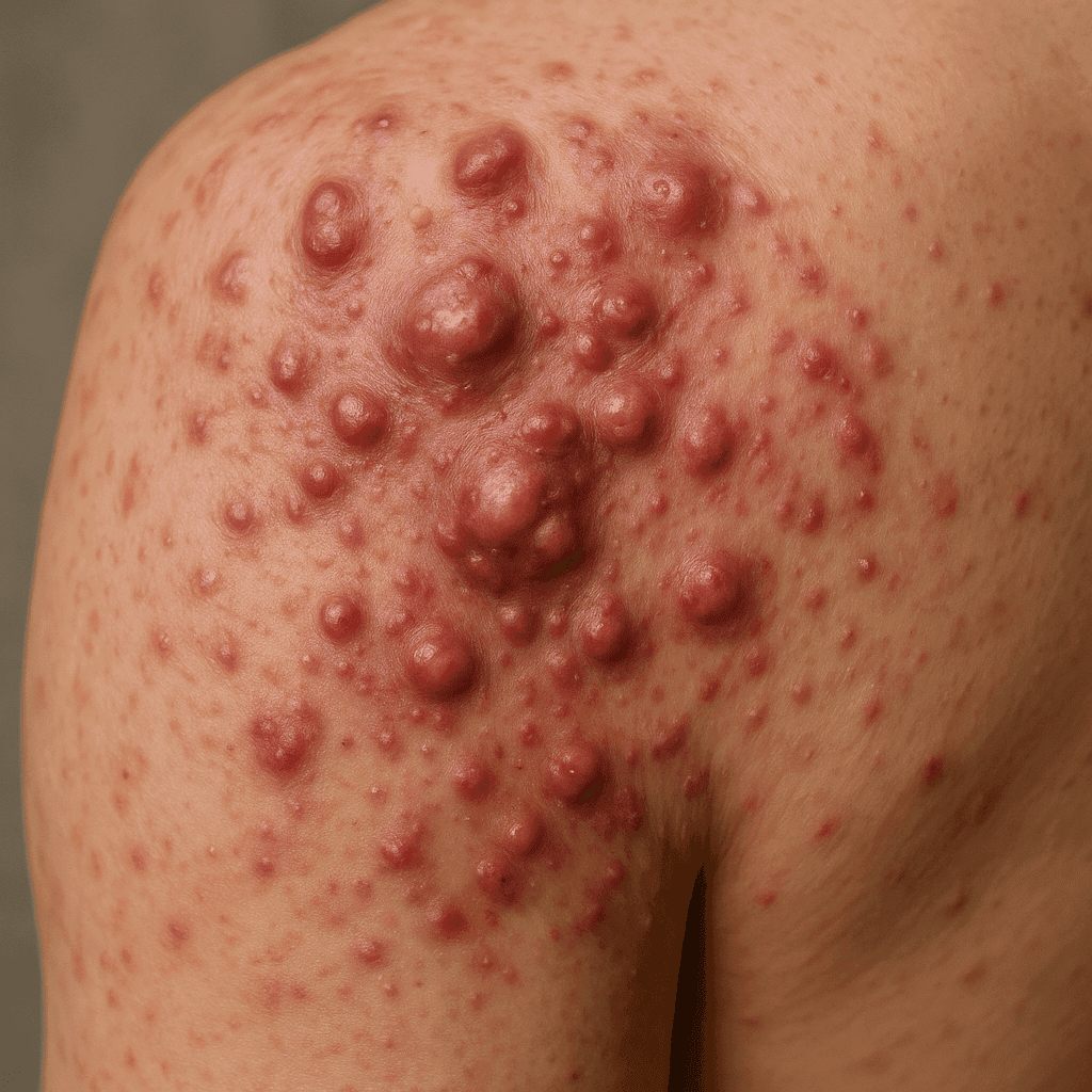 A acne quística manifesta-se através de lesões grandes e dolorosas, muitas vezes profundamente enterradas na pele. Ao contrário de outras formas de acne, como a acne juvenil, estas lesões podem deixar cicatrizes permanentes. É importante ser capaz de reconhecer estes sintomas numa fase inicial para que o tratamento adequado possa ser implementado mais rapidamente e as potenciais complicações reduzidas.