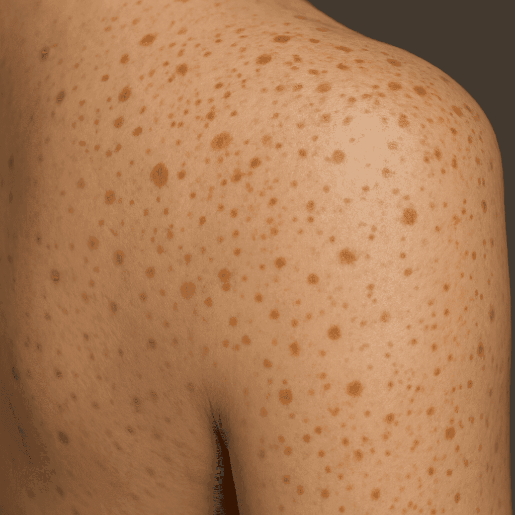 Freckles are small, flat, tan, or light brown spots on the skin that often become more pronounced with sun exposure. Unlike lentigines, freckles are generally a genetic trait, influenced by the MC1R gene. They are more common in people with lighter skin tones and tend to appear during childhood.
